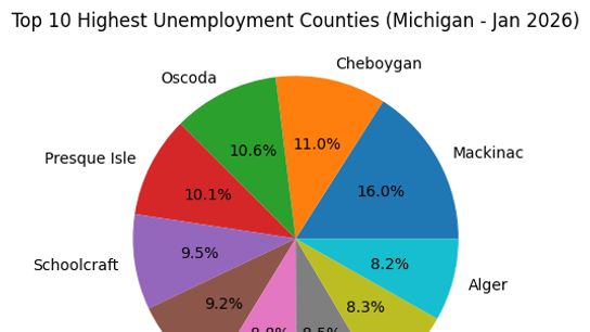 A closer look at the top 10 highest unemployment counties highlights an important trend: many of Michigan’s highest unemployment rates are concentrated in northern and rural areas, while more urban and university-driven regions remain comparatively stable.